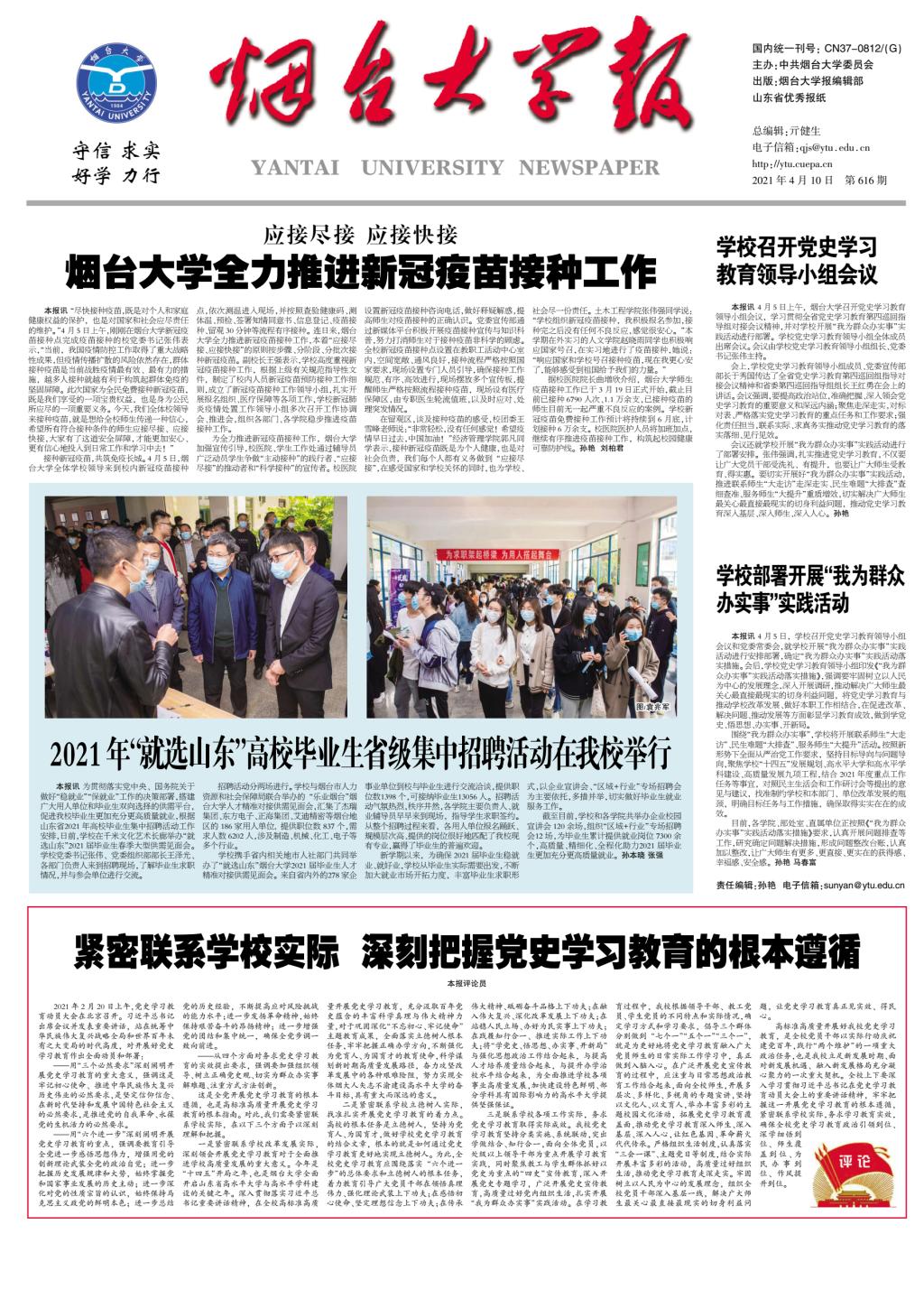 一是紧密联系学校改革发展实际,深刻领会开展党史学习教育对于全面推进学校高质量发展的重大意义。今年是“十四五”开局之年,也是yth20611游艇会网站全面开启山东省高水平大学与高水平学科建设的关键之年。深入贯彻落实习近平总书记重要讲话精神,在全校高标准高质量开展党史学习教育,充分汲取百年党史蕴含的丰富科学真理与伟大精神力量,对于巩固深化“不忘初心、牢记使命”主题教育成果,全面落实立德树人根本任务,牢牢把握正确办学方向,不断强化为党育人、为国育才的教育使命,科学谋划新时期高质量发展路径,奋力攻坚改革发展中的各种艰难险阻,努力实现全体烟大人矢志不渝建设高水平大学的奋斗目标,具有重大而深远的意义。