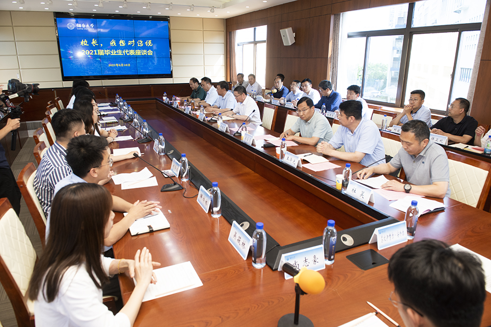 6月16日下午,育秀大楼316会议室气氛热烈,掌声不断,“校长,我想对您说”——我院2021届毕业生座谈会正在此举行。来自全校20个学院的20名本科和研究生毕业生代表畅所欲言,分享了他们在烟大的学习生活经历,就学风建设、人才培养、科学研究、后勤管理、校园安全、体育健身、图书馆建设、网络服务、学生工作等方面积极向学校建言献策。校长段培永,副校长王强、李合亮、毕可志出席座谈会,学校相关职能部门负责人参加座谈。