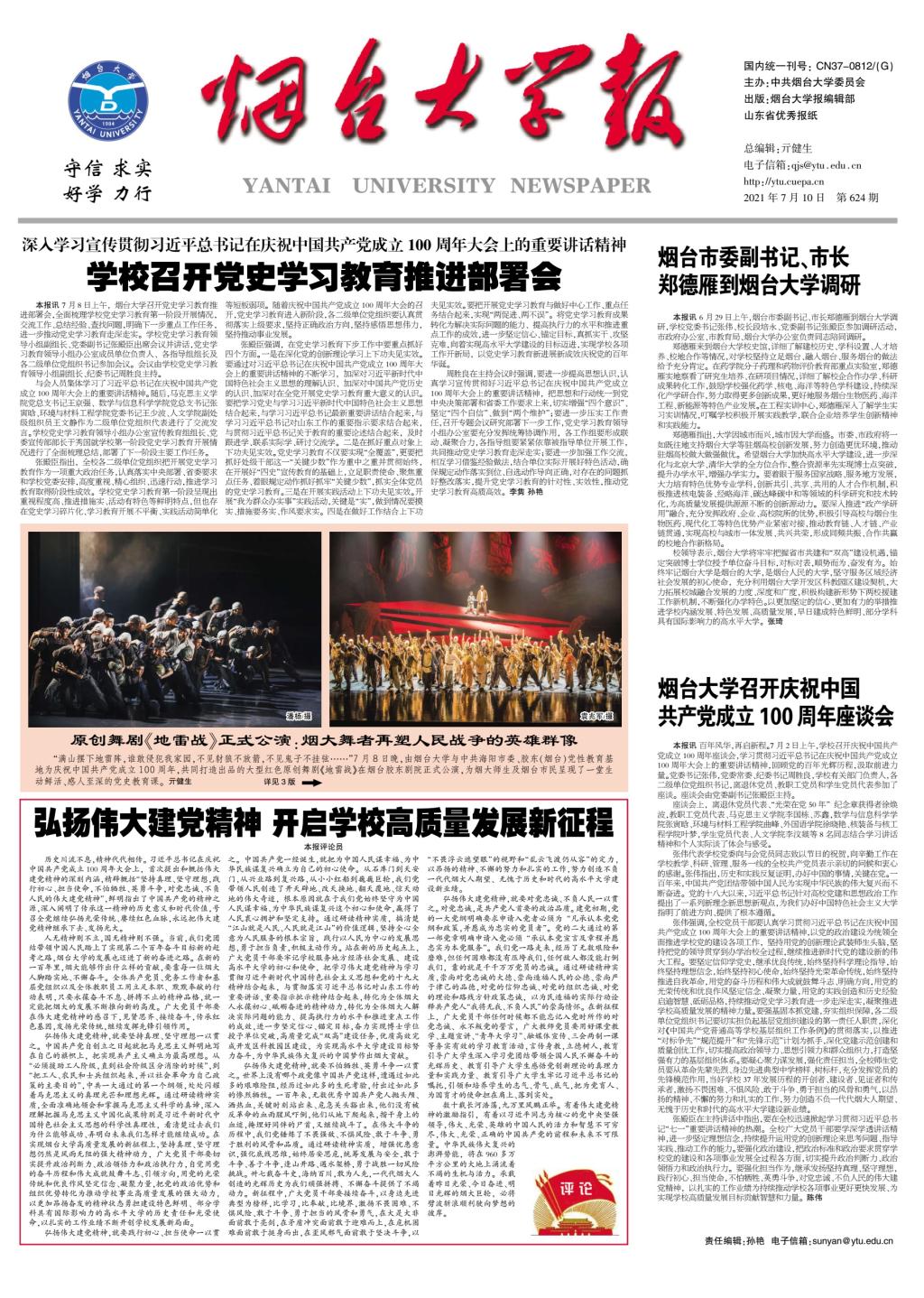 人无精神则不立,国无精神则不强。当前,我们党团结带领中国人民踏上了实现第二个百年奋斗目标新的赶考之路,yth20611游艇会网站的发展也迈进了新的奋进之路。在新的一百年里,烟大能够作出什么样的贡献,要靠每一位烟大人脚踏实地、不懈奋斗。全体共产党员、党务工作者和基层党组织以及全体教职员工用立足本职、默默奉献的行动表明,只要永葆奋斗不息、拼搏不止的精神品格,就一定能把烟大的发展不断推向新的高度。广大党员干部要在伟大建党精神的感召下,见贤思齐、接续奋斗,传承红色基因,发扬光荣传统,继续发挥先锋引领作用。