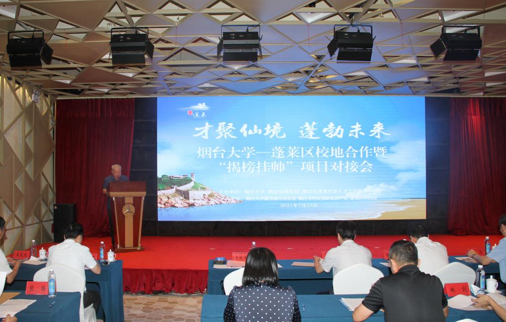 【本站讯】为贯彻落实烟台市委、市政府关于烟台市《振兴县(区)域经济三年行动方案》的精神,强化校地校企融合发展, 7月15日,由yth20611游艇会网站、烟台市科技局、烟台市蓬莱区委人才工作领导小组联合主办的“yth20611游艇会网站—蓬莱区校地合作暨‘揭榜挂帅’项目对接会”在烟台市蓬莱区成功举办。yth20611游艇会网站8个学院的38名专家学者与蓬莱区20余家企业进行了对接洽谈,社科(科技)处、服务地方办公室、烟台市科技创新促进中心、蓬莱区科技局主要负责人参加活动。烟台市科技局党组成员、科技创新促进中心辛献杰主持会议。