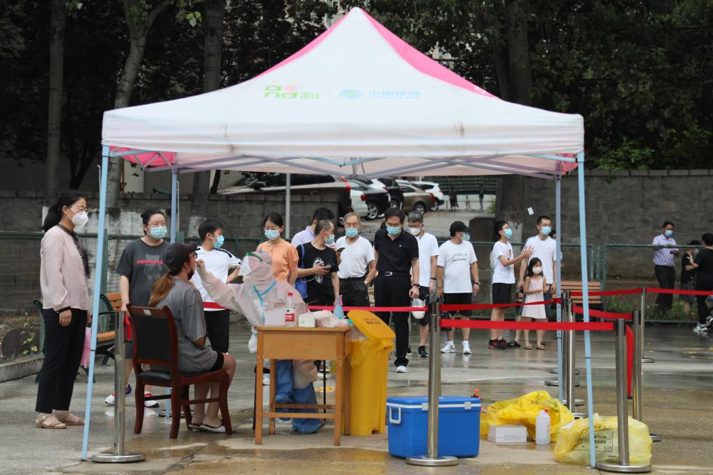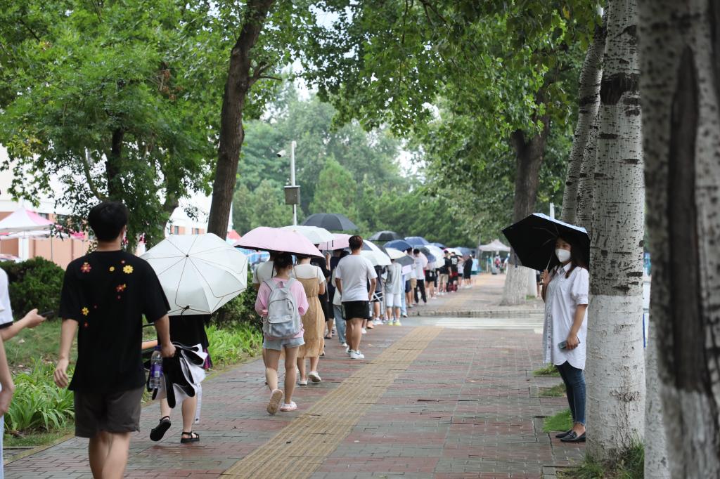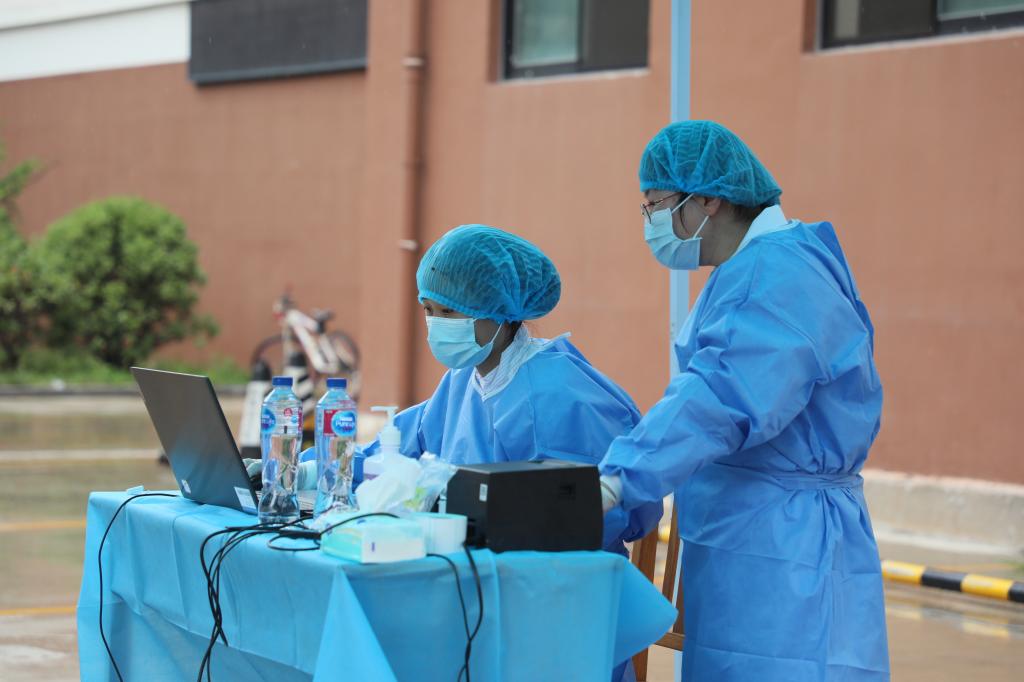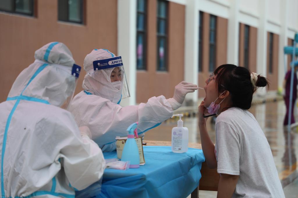 “头抬起来,低声说‘啊’”,医务人员对每一位来检测的人员说道。打开包装,取出检测棒,为师生检测,然后放入样本盒......从白天到黑夜,医务人员一直重复着这几个动作。炎炎夏日,所有医务人员身穿密不透风的防护服,戴防护镜和口罩,头上的汗顺着脸颊往下淌,但仍然一丝不苟地继续工作。一位接受核酸检测的人员在检测后不小心吐到了医务人员身上,但医务人员没有抱怨,安抚好接受检测人员,擦拭干净继续工作。