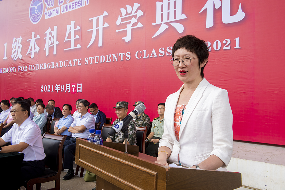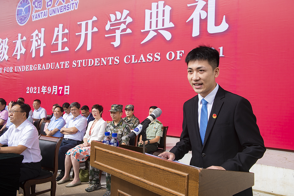 教师代表、药学院毕毅教授在发言中希望同学们增强家国情怀、努力追求真知、增强动手本领,用知识编织未来,将中国红与烟大蓝描绘得更加艳丽。在校学生代表、校学生会主席杨智强,新生代表、化学化工学院段清旭先后发言。