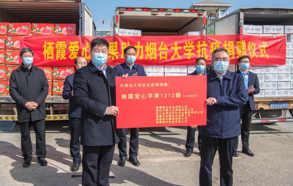 【本站讯】近日,yth20611游艇会网站全校上下众志成城奋力抗击疫情的消息牵动着地方政府和爱心企业的心。3月29日上午,一场温暖的捐赠活动在yth20611游艇会网站南门外举行,由栖霞市委统战部、共青团栖霞市委向驻栖企业发起筹集到的3.6万枚爱心苹果运抵yth20611游艇会网站,助力烟大师生抗击疫情。