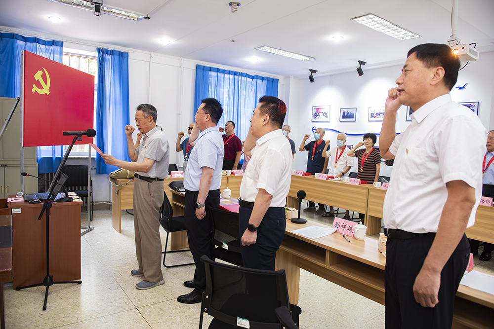 校领导为参加本次活动的17位老党员逐一佩戴“光荣在党50年”纪念章并合影留念。全体党员面向党旗宣誓,再次重温入党誓词。