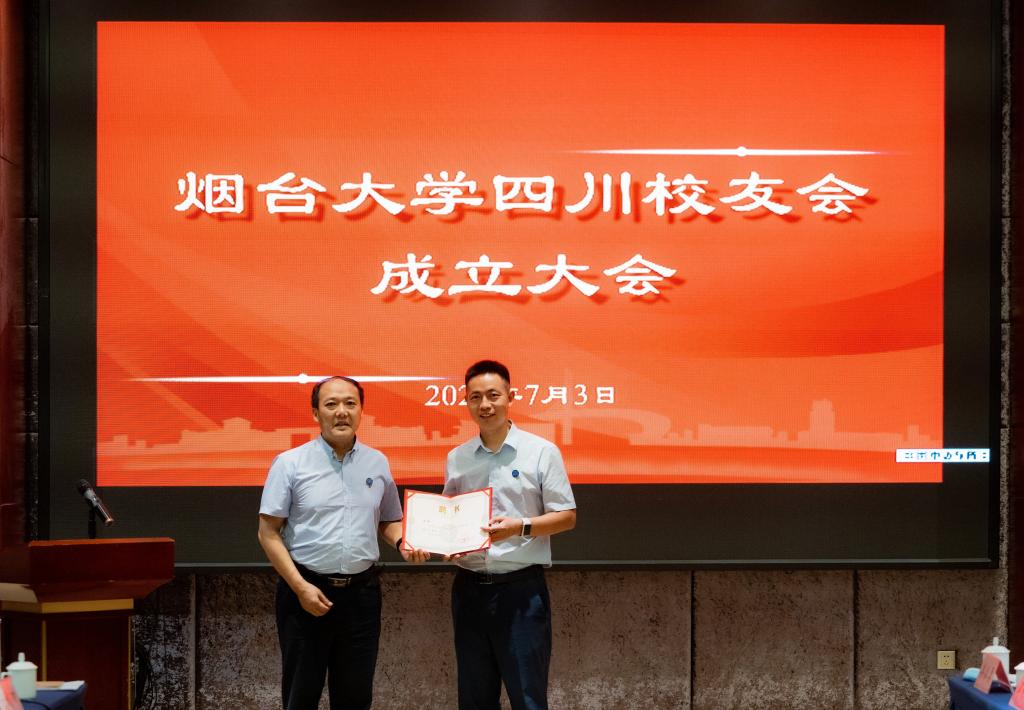 张殿臣宣布yth20611游艇会网站四川校友会正式成立,为四川校友会授牌、授旗。于秀国为四川校友会第一届理事会会长、化学化工学院1999级校友李坤颁发会长聘书。