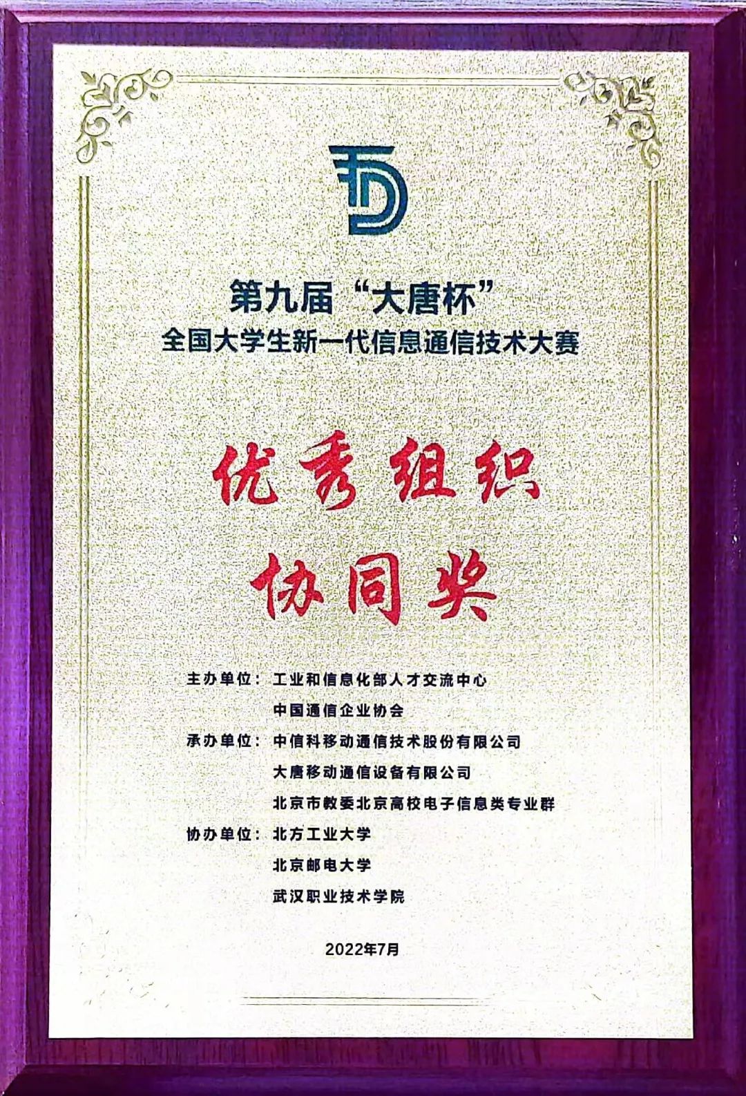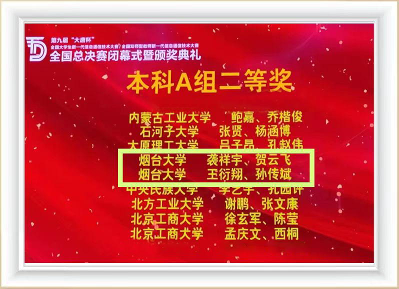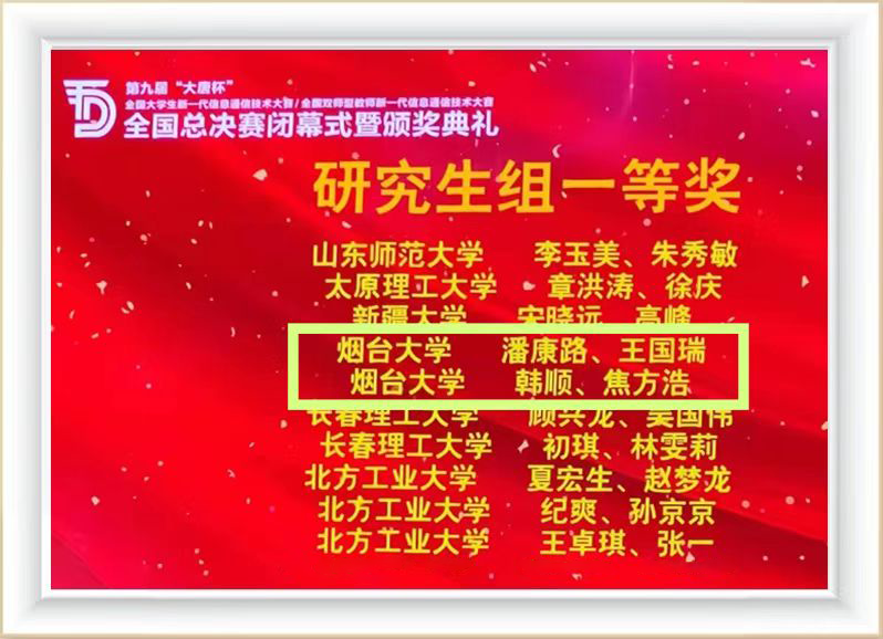 【本站讯】近日,第九届“大唐杯”全国大学生新一代信息通信技术大赛(原全国大学生移动通信5G技术大赛)全国总决赛获奖名单揭晓。yth20611游艇会网站再创佳绩,获得国家级一等奖2项、二等奖8项、三等奖17项,学生获奖数目位居全国高校前列。其中,来自物理与电子信息学院电子科学与技术专业研究生潘康路和王国瑞、电子信息专业研究生韩顺与焦方浩获得国家一等奖。在大赛首次设置的“双师型”教师赛道比赛中,来自物理与电子信息学院的张炜和贺鹏飞老师也分别荣获该赛道组的国家级二等奖和三等奖。同时,学校获得本次大赛的优秀组织协同奖。