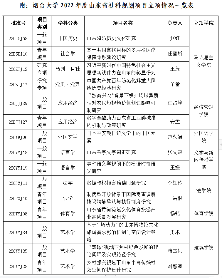 【本站讯】近日,2022年度山东省社科规划年度项目和山东省习近平新时代中国特色社会主义思想研究中心党的十九届六中全会精神研究专项(以下简称研究专项)立项结果公布,yth20611游艇会网站共有15个项目入选,立项数位居全省高校第9位。据悉,本年度全省共申报2416项,立项590项,其中年度项目558项、研究专项32项,立项率为24.4%。据统计,yth20611游艇会网站各学院年度项目限项申报37项,立项13项,立项率为35.1%,居全省高校第4位;研究专项申报2项,立项2项,立项率为100%。