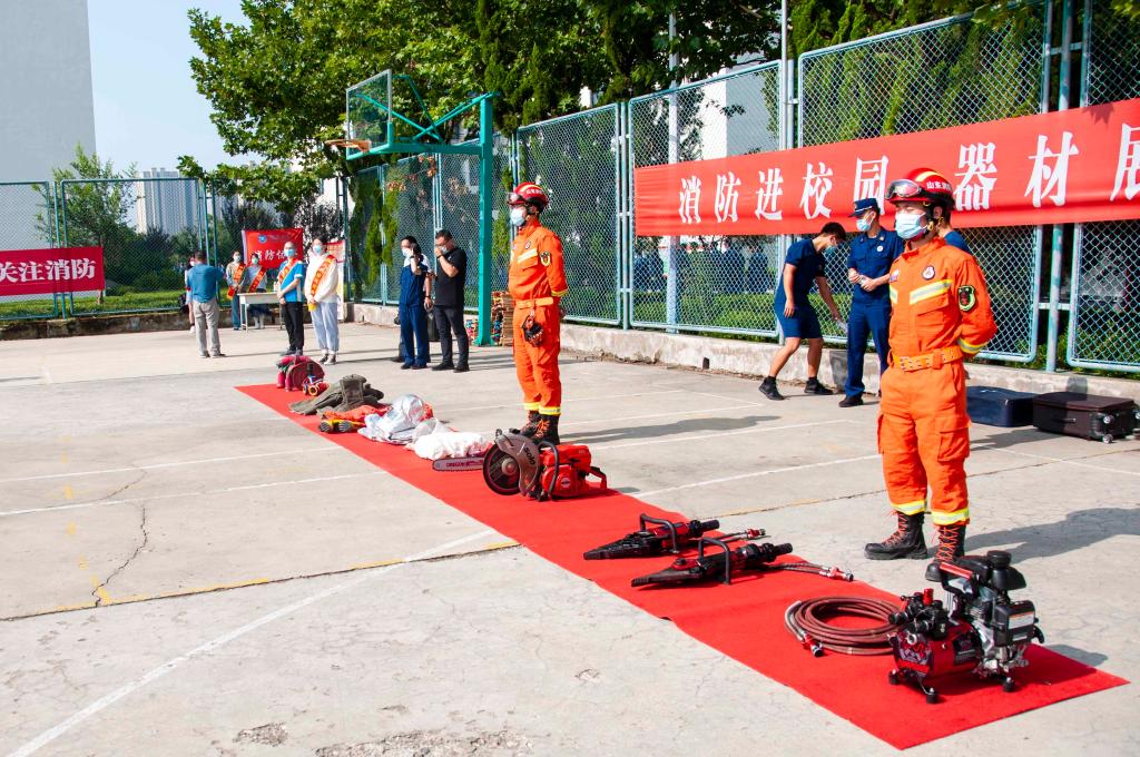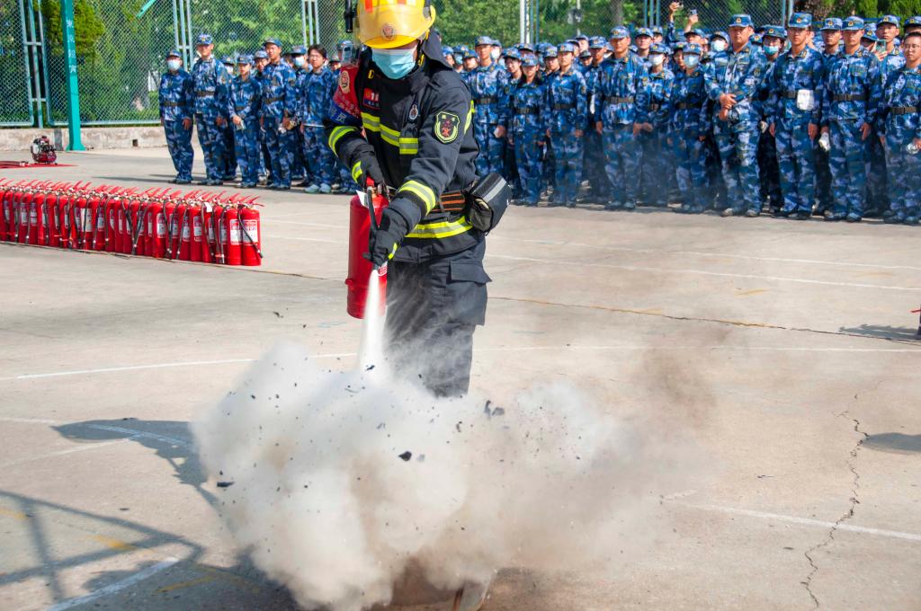 8点30分,王强一声令下,演练正式开始。地震警报随之响起,新生在宿舍按要求进行紧急避震;8点31分,火灾警报响起,同学们用湿毛巾捂住口鼻向安全地带迅速、有序撤离。同时,莱山区消防救援大队官兵第一时间把“受伤学生”用担架抬至校医院救护车进行“救治”。演练结束后,消防大队官兵为300余名新生义务消防员进行了灭火器使用方法演示、现场灭火演练和消防器材展示。
