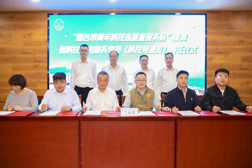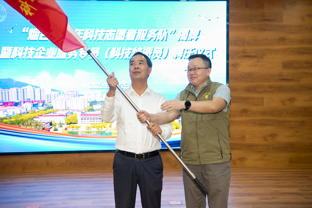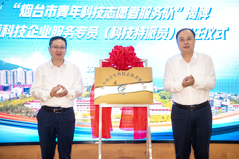 段培永、韩耀东共同为烟台市青年科技志愿者服务队揭牌,烟台市科技局局长李杰为服务队授队旗。仪式现场,烟台市青年科技志愿者服务队与企业代表签订服务协议。仪式上,相关领导为科技企业服务专员颁发了聘书。