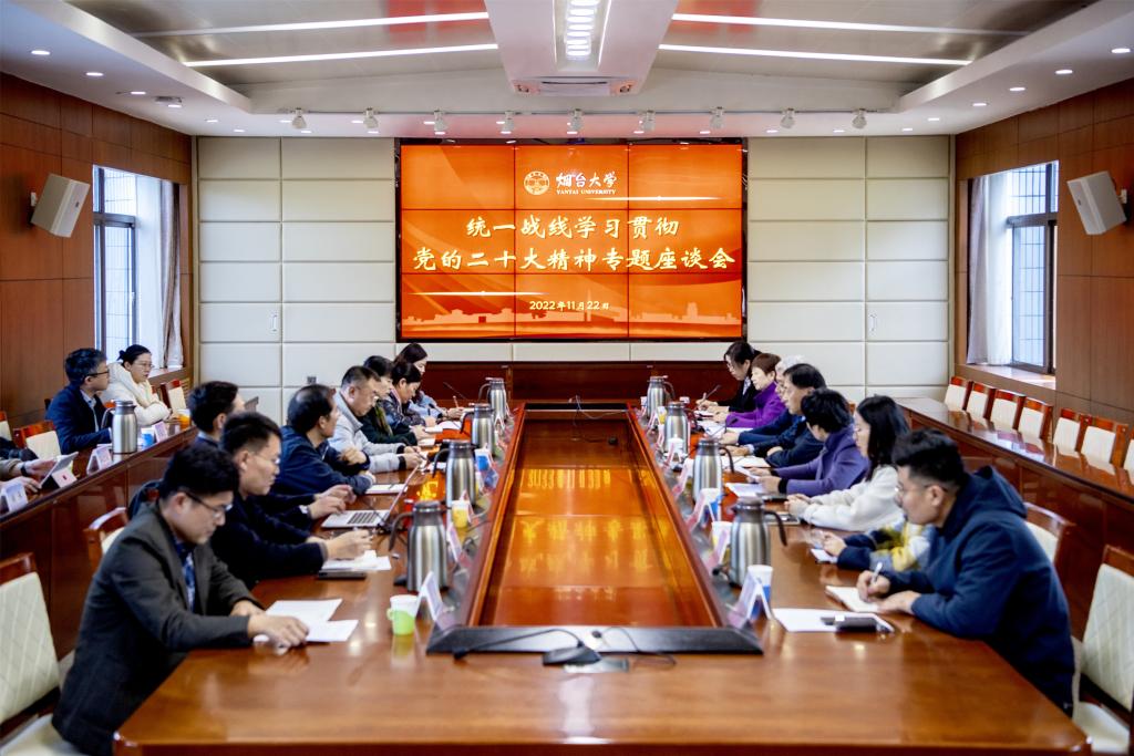就学校统一战线进一步做好党的二十大精神的学习宣传贯彻工作,张殿臣强调,要深入学习领会党的二十大精神,不断巩固共同思想政治基础,把学习宣传贯彻党的二十大精神作为当前和今后一个时期的首要政治任务,精心组织学习,把党的二十大精神作为贯穿统一战线各项主题教育活动的主线,结合各自党派、团体的实际,多层次、多形式推动党的二十大精神入脑入心。要努力加强自身建设,不断提升履职尽责能力和水平,坚持以学习贯彻党的二十大精神为契机,不断加强思想建设、组织建设、履职能力建设、作风建设和制度建设,进一步提高政治把握能力、参政议政能力、组织领导能力、合作共事能力和解决自身问题能力,主动担当作为,积极履职尽责,精准建言献策。要充分发挥统战优势,不断推动学校和地方经济社会高质量发展,落实立德树人根本任务,深度服务教育强国、科技强国和人才强国建设,主动融入学校中心工作和山东省经济社会发展大局,充分发挥人才荟萃、智力密集、资源丰沛、联系广泛的优势,真正将党的二十大精神的学习宣传贯彻成果转化为解决现实问题、推动学校高水平大学建设和地方经济社会高质量发展的实际成效,在全面建设社会主义现代化国家、以中国式现代化全面推进中华民族伟大复兴新征程上做出新的更大贡献。