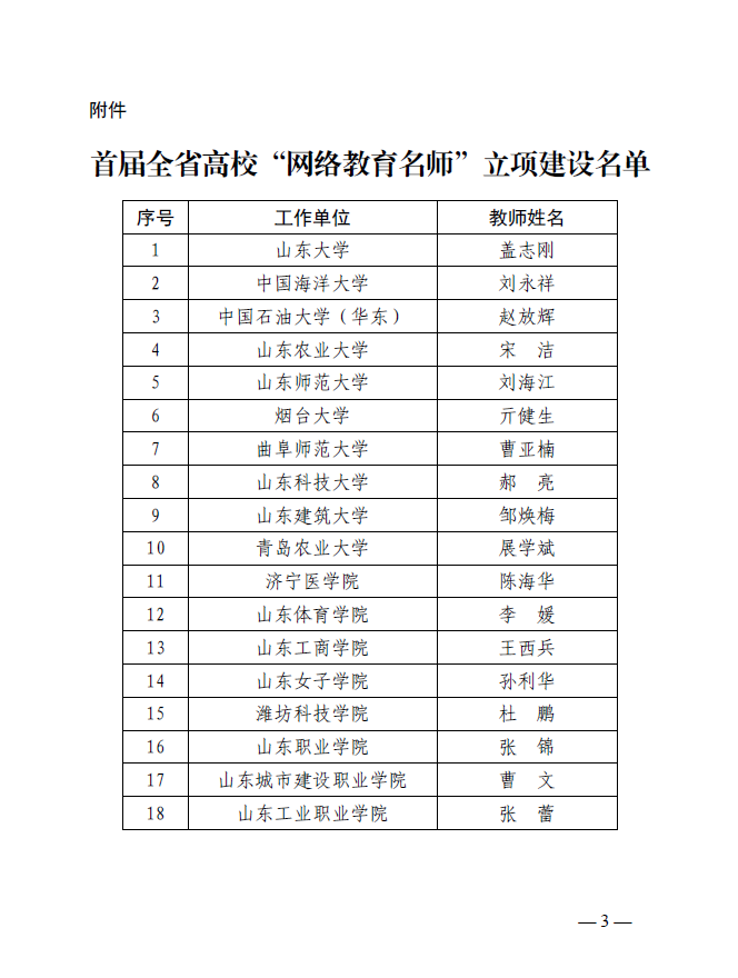2022年,山东省首度实施省级“高校网络教育名师”培育支持计划。经学校推荐、资格审查、专家评审、半年考察和结果公示等环节,在全省范围内共评选出18名教师为首届全省高校“网络教育名师”,给予立项建设支持。根据安排,省教育厅将在“网络教育名师”项目建设期内加强指导,严格管理,定期考核,通过课题立项、培训学习、研讨交流、成果展示等方式给予支持,带动高校和入选教师共同推进网络思想政治工作。入选教师将聚焦立德树人根本任务,立足理论宣传教育、网络热点阐释、网络作品创作、网络人才培养、网络阵地建设、网络机制研究等职责,充分发挥示范引领作用,扎实开展工作,提高网络育人实效。