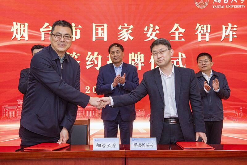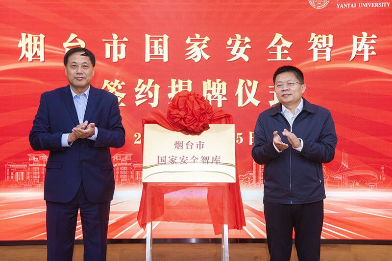 【本站讯】4月15日,烟台市国家安全智库签约揭牌仪式暨全民国家安全教育日活动在我院举行。烟台市委常委、秘书长、国安办主任于锋与yth20611游艇会网站党委书记张殿臣共同为烟台市国家安全智库揭牌,烟台市委副秘书长吴德文与yth20611游艇会网站党委副书记郭建国签署合作共建协议。