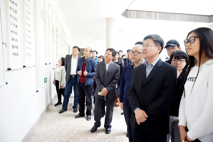 为庆祝党的十九大胜利召开,10月16-20日,“学习宣传贯彻十九大精神”学生书画作品展在承先图书馆展出。20日上午,党委书记张伟,党委常委、纪委书记周胜良,相关职能部门和部分学院负责人,学生书画协会指导老师及部分学生代表一同参观了展览。张伟充分肯定了同学们作品的思想立意和艺术水准,并勉励大家在做学问、干事业中继承发扬这种“勤学苦练,不怕困难”的精神,提升自己的专业能力和素养,为实现中华民族伟大复兴的中国梦贡献自己的青春力量。