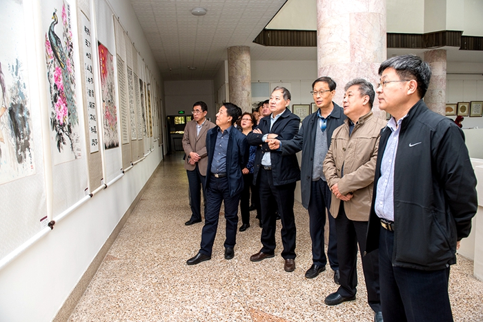 书人生感怀,画校园风景,摄社会百态,展国家繁荣。在中国特色社会主义进入新时代之际,学校举行教工书画展热烈庆祝党的十九大胜利召开。10月24日上午,校党委书记张伟、副校长孙祥斌、宋中民,纪委书记周胜良与党委宣传部、党委统战部、校工会、校团委、学生工作处、机关党总支等部门和部分学院领导一起来到承先图书馆参观教工书画摄影展。张伟指出,作品充分展现了国家过去五年的发展成就,体现了全校教职工对美好生活的追求,我们要不忘初心砥砺奋进,在习近平新时代中国特色社会主义思想引领下,为学校的进一步发展、为中华民族伟大复兴中国梦的实现贡献自己的力量。