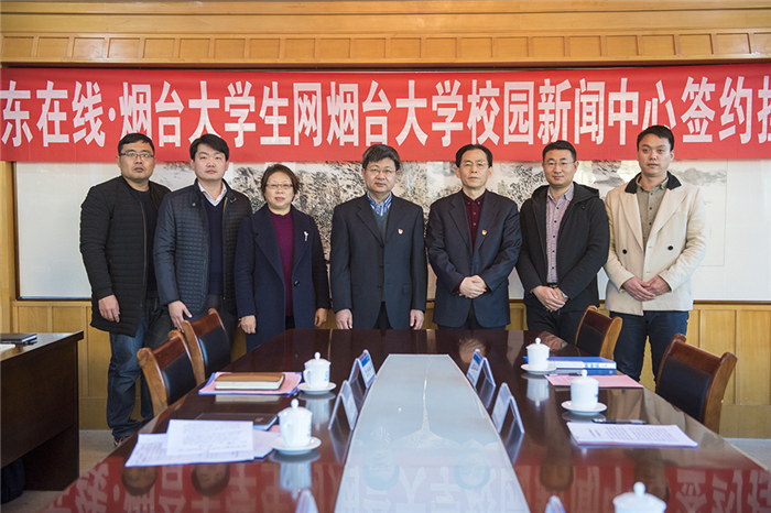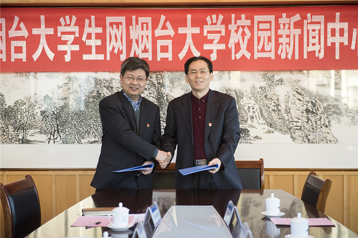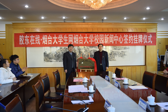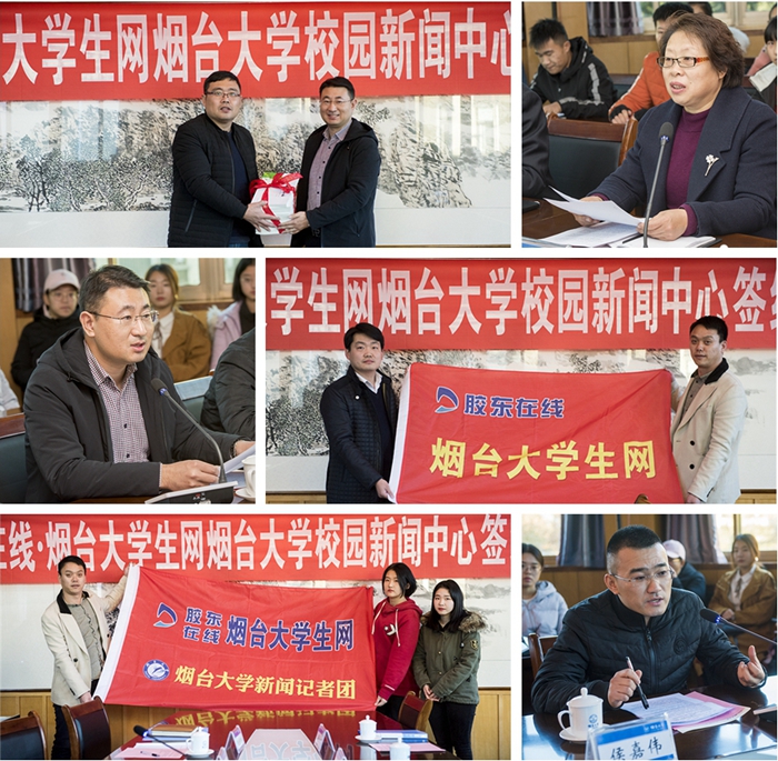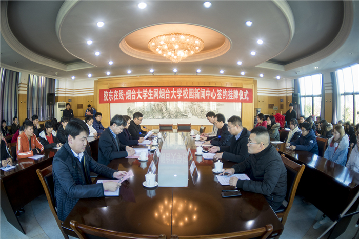 12月8日下午,胶东在线·yth20611游艇会网站生网“yth20611游艇会网站校园新闻中心”签约挂牌仪式在yth20611游艇会网站办公楼201会议室举行。校党委书记张伟与烟台广播电视台副台长、胶东在线总编辑邓兆安签署“yth20611游艇会网站校园新闻中心”合作协议并揭牌。仪式由党委宣传部部长何世新主持。校团委书记朱兴、校党委宣传部副部长王晓刚、胶东在线政教部主任石一鸣、yth20611游艇会网站生网主编司友志、胶东在线首席记者侯嘉伟及学校新闻中心、校团委学生记者参加仪式。