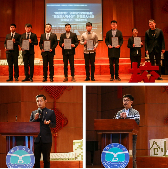 活动现场揭晓了由张国臣、朱晓磊、张成建三位校友共同设立的法学院“零壹梦想”创新创业教育基金面向全校举办的“我在烟大有个梦”——2017烟大学生梦想助力计划的资助名单,法学院大一新生冯建东的“诗集出版”、yth20611游艇会网站创行团队的“‘果落菌生’助农产业转型”、化院海燕团队的“季铵盐型超支化聚硫醚对于织物的改性”、化院启梦团队的“笔芯回收”、法学院哈哈法律援助团的“山区留守儿童普法”、建筑学院遇建团队的“乡村建筑工作室”、yth20611游艇会网站书画协会的“校园内传统文化感受碑廊”、人文学院大四学生李海翔的“小说出版”等8个梦想计划获得资助。张成建校友为他们颁发资助证书。来到活动现场的7位受资助的“梦想者”以3分钟演讲的形式展示了他们的梦想计划。随后,朱晓磊校友上台致辞,讲述了“零壹梦想基金”的缘起,并鼓励同学们一定要坚持梦想,希望受资助者在有能力的时候,也能以这样的方式回馈母校。
