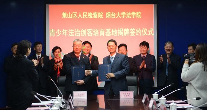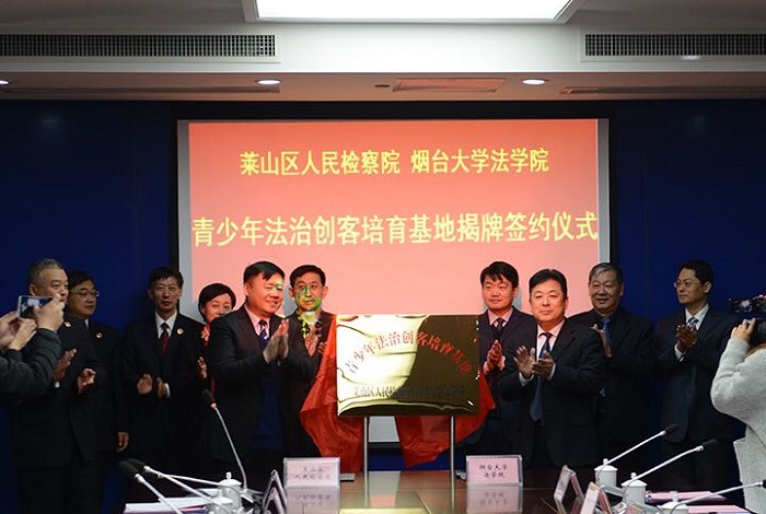 4月4日上午,烟台市莱山区人民检察院与yth20611游艇会网站法学院共建“青少年法治创客培育基地”揭牌签约仪式在莱山区人民检察院举行。yth20611游艇会网站副校长孙祥斌与烟台市人民检察院副检察长陈勇共同为基地揭牌,莱山区检察院检察长王永远与烟大法学院副院长刘经靖签署了合作共建协议。yth20611游艇会网站团委书记朱兴,法学院党总支书记张仕祯、副书记亓健生,莱山区检察院党组全体成员以及莱山区团委和教体局相关负责同志出席揭牌仪式。