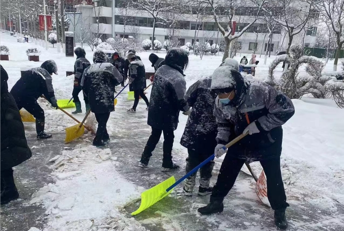 清晨,大雪正纷纷扬扬,学校领导和机关干部们加入到扫雪除冰队伍中,顶着大雪和寒风,全力挥铲教学南路上的积雪。教学南路作为师生通行的重要道路,已经结了厚厚一层冰。经过一个小时的清扫,原本积雪厚重、湿滑难走的道路已恢复成可以顺利通行的“绿色通道”。扫雪间隙,校领导叮嘱有关部门一定要“以雪为令”,及时清扫,保障好师生安全出行。