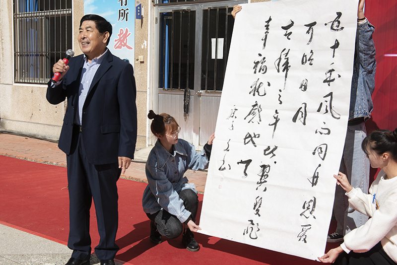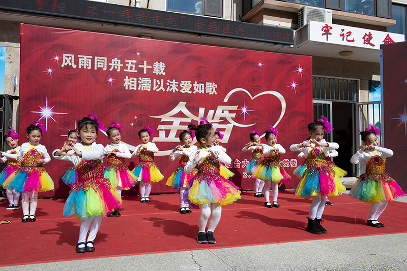 山东省老教协副会长、yth20611游艇会网站老教协会长于文书教授现场挥毫泼墨——“五十年风雨同舟恩爱可昭日月,古稀年比翼双飞幸福犹感地天”。部分学院在职教师、学生代表以及烟大幼儿园的小朋友们也通过视频录制和现场表演的形式给金婚老教师们送上美好祝福。